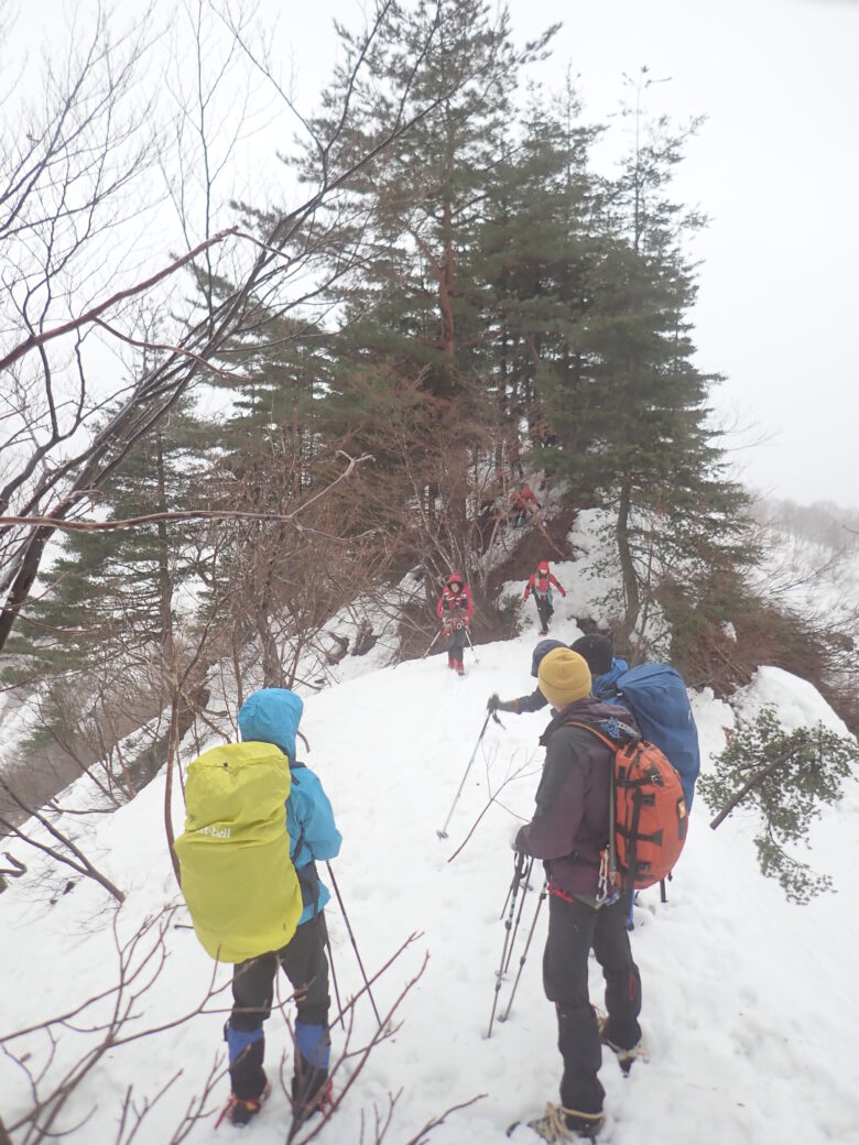 ところが雪の状態も悪く、極細の尾根。